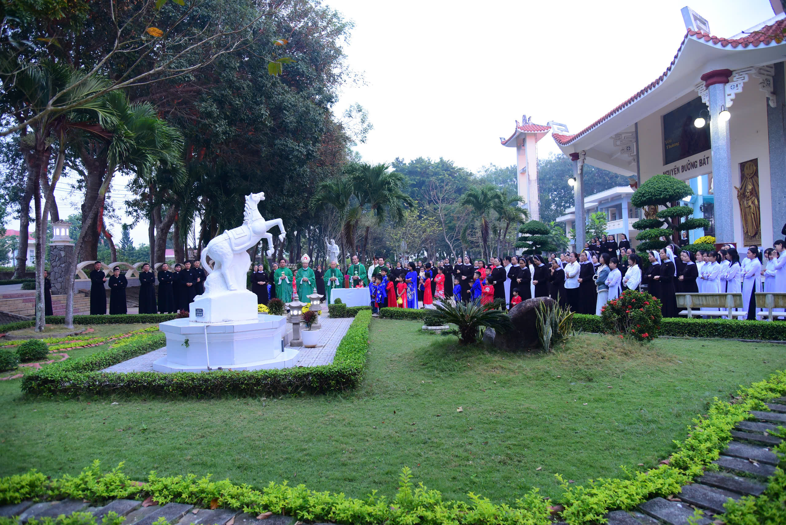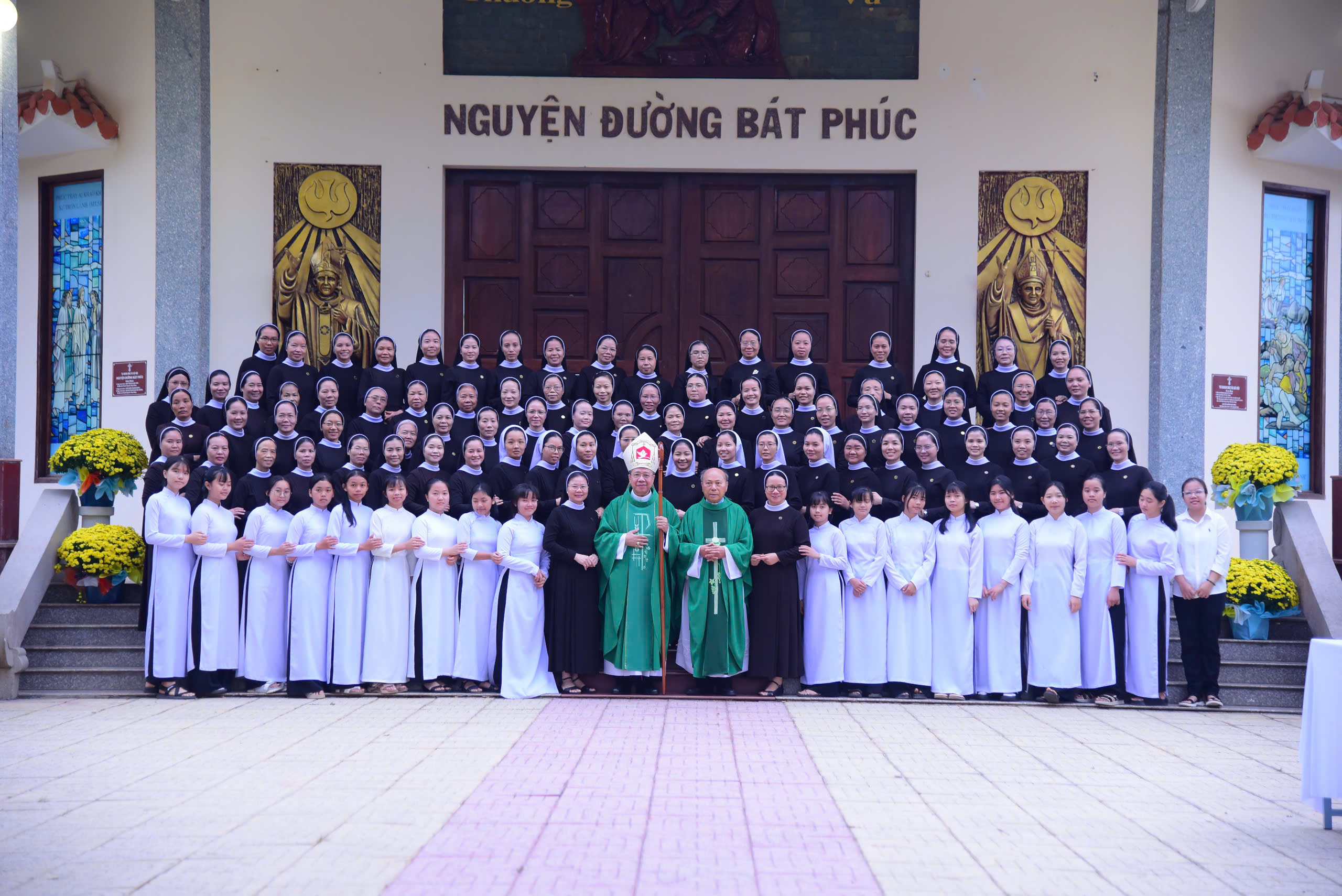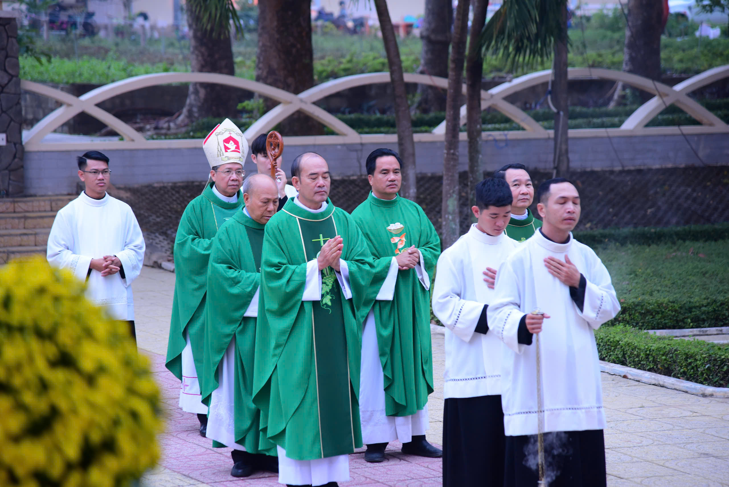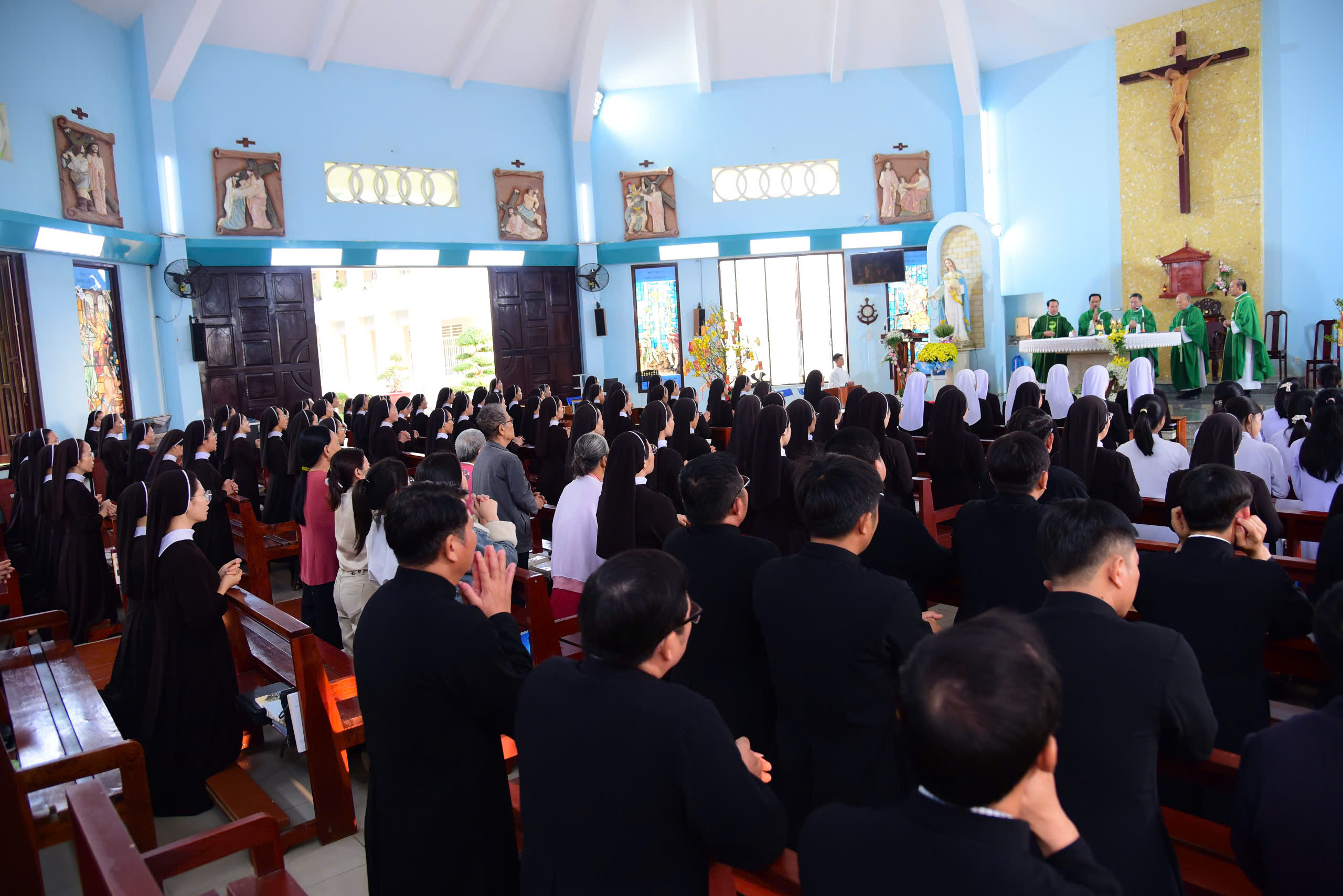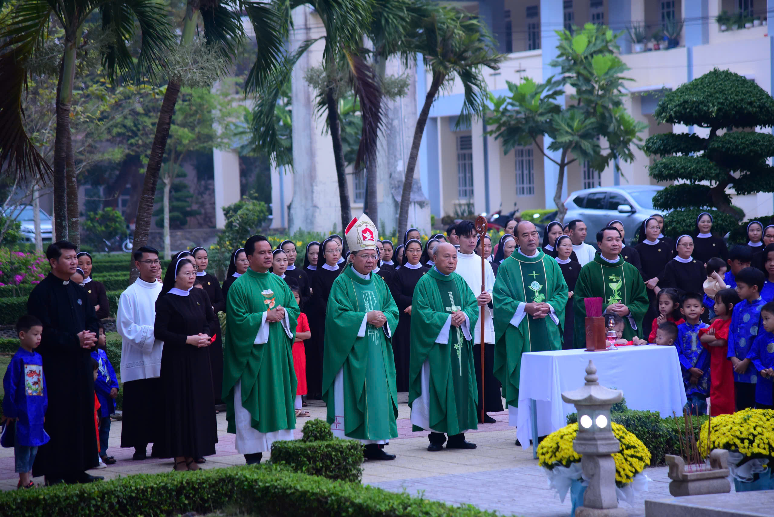 Tiếp nối những giây phút lắng đọng bên phận mộ Đức cha Phaolô, cộng đoàn cùng tiến vào Nguyện đường Bát Phúc hiệp dâng thánh lễ tất niên với tâm tình tạ ơn dâng lên Thiên Chúa trọn vẹn hành trình một năm qua nối kết với niểm hy vọng vào hồng ân Thiên Chúa trong năm mới Bính Ngọ 2026 do Đức cha Giuse Đỗ Mạnh Hùng chủ tế, đồng tế với ngài có Đức ông Phêrô Nguyễn Chí Thiết, Quý cha Tu đoàn Anh Em Bác Ái Chúa Kitô Tôi Tớ. Tham dự thánh lễ có quý nữ tu Tu đoàn, quý cụ bà đến từ Mái Ấm Thiên Phước và các cháu Làng Thiếu Nhi Mẹ Hiền.