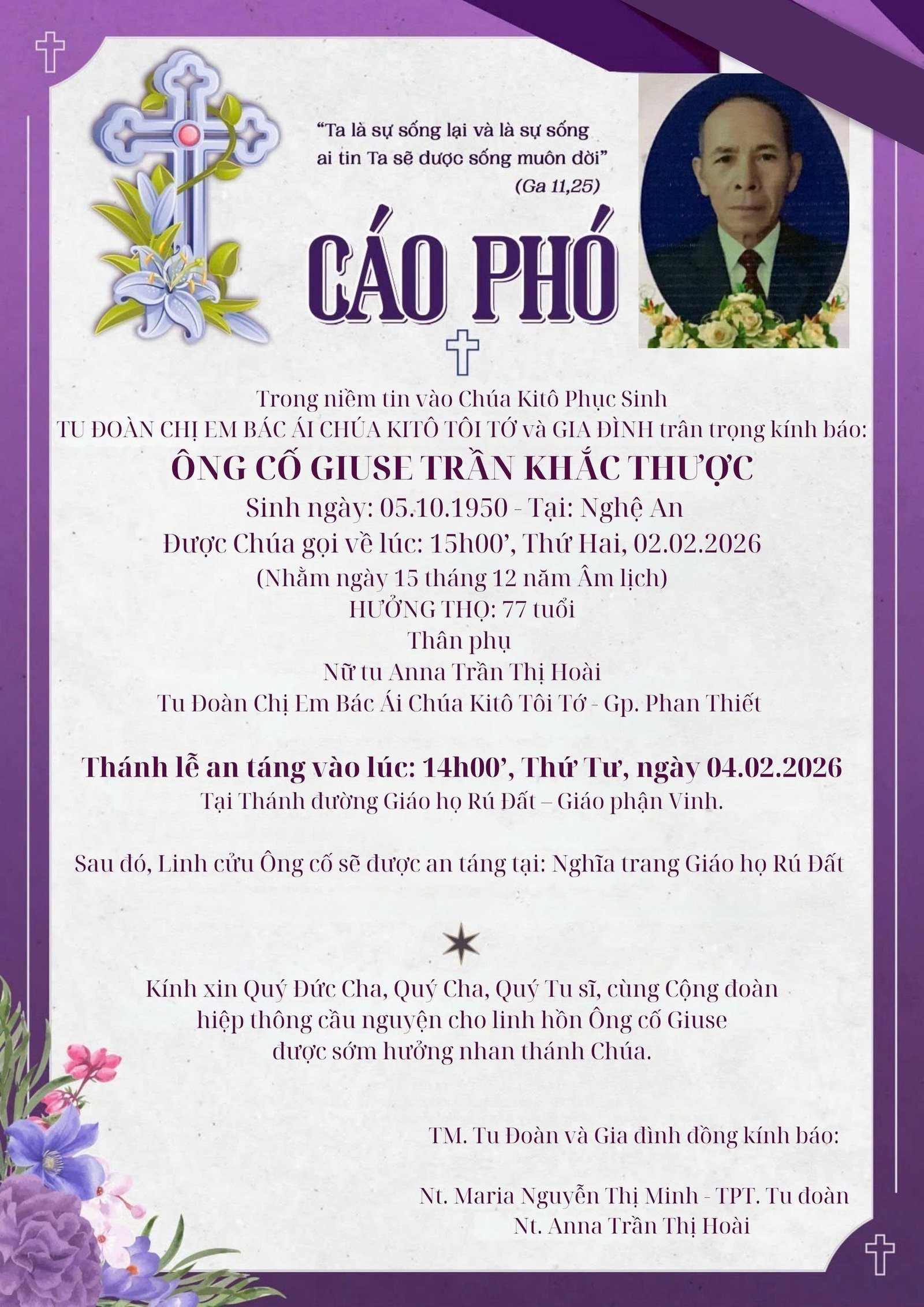 Kính xin quý Đức cha, quý cha, quý tu sĩ cùng cộng đoàn hiệp thông cầu nguyện cho linh hồn ông cố Giuse Trần Khắc Thược là thân phụ của nữ tu Anna Trần Thị Hoài – Tu đoàn Chị Em Bác Ái Chúa Kitô Tôi Tớ – Gp. Phan Thiết, mới qua đời sớm được hưởng hạnh phúc nước trời.