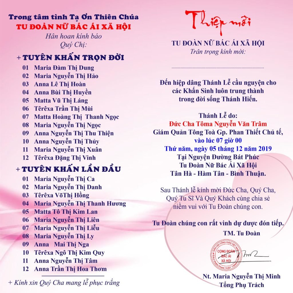 Xin kính mời Quý Cha, Quý Tu Sĩ nam nữ, Quý Ân Nhân, Thân Nhân và Quý Khách. Đến hiệp dâng Thánh Lễ và cầu nguyện cho các Khấn Sinh.