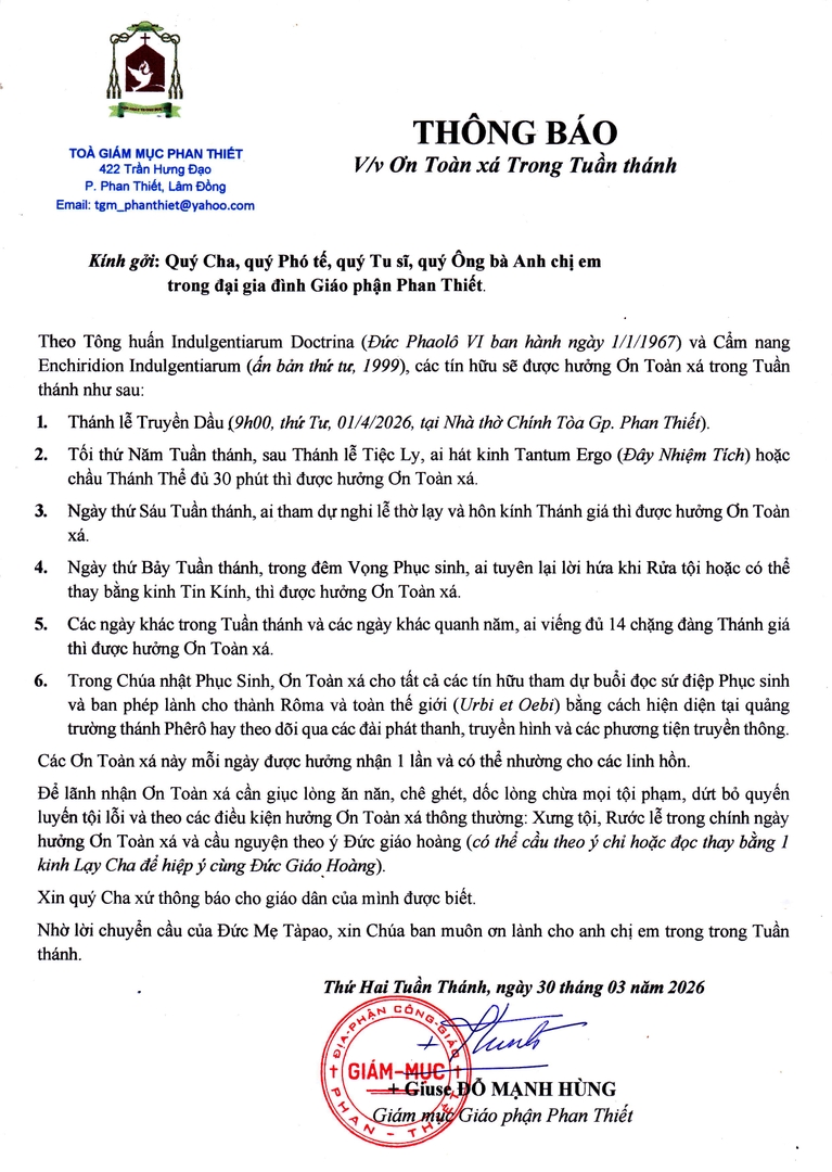 WGPPT (03/4/2026) – Sau đây là nguyên văn Thông báo của Văn phòng Tòa Giám mục về Ơn Toàn xá trong tuần Thánh.