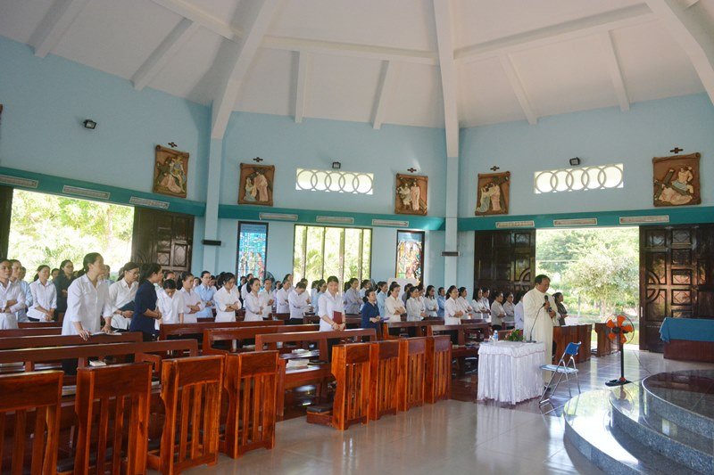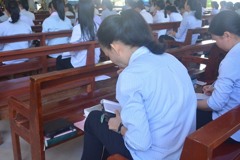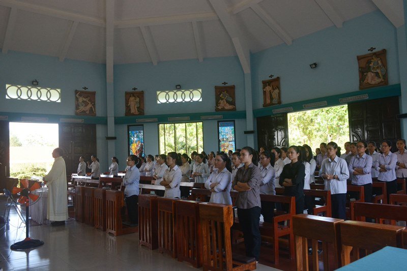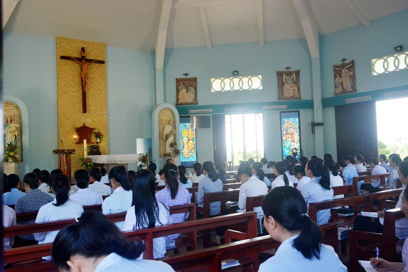 Sau bài giảng của Cha Gioan, trong bầu khí thinh lặng, các chị em dành hết tâm tình của mình bên Chúa Giêsu Thánh Thể để cầu nguyện, chiêm ngắm và kín múc nguồn sức mạnh tình yêu từ Thánh Thể, sau đó là giờ chia sẽ chung theo từng lớp thật ý nghĩa.